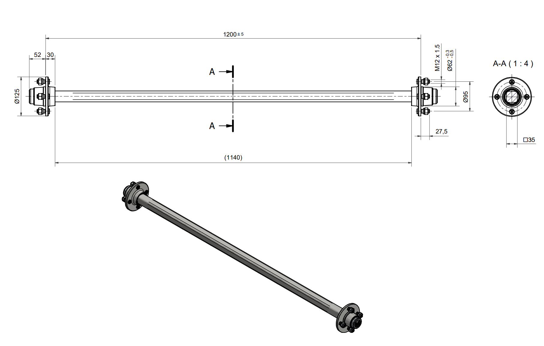 OSOVINA ZA PRIKOLICO 950 kg BREZ ZAVOR (1200 mm)