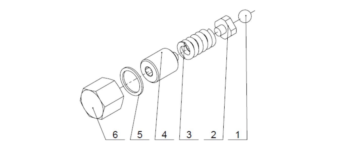 Standard fabriksinställning är 150 bar. Den justerbara avlastnings- (säkerhets-) ventilen kan justeras genom att ta bort muttern (6) och vrida justerskruven (4). Att vrida skruven medurs ökar trycket, medan att vrida den moturs minskar trycket i driftssystemet.