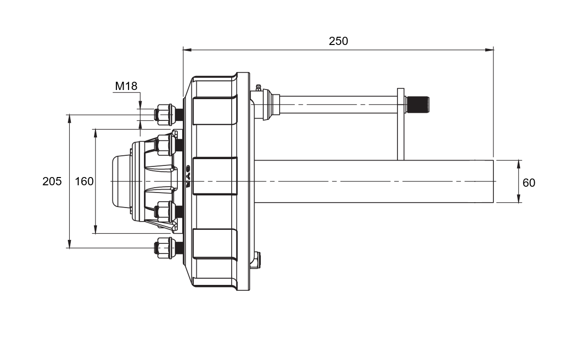 Stubaxeln är avsedd för användning på olika typer av släp med bromssystem. Stubaxelns längd är 250 mm med en lastkapacitet på upp till 2700 kg.