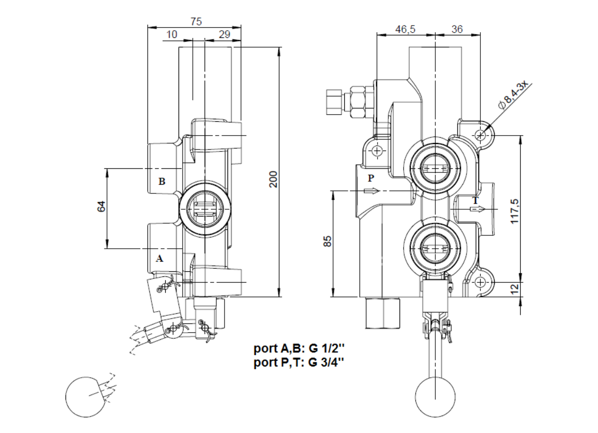 | Anslutningsgänga: | P- och T-port – 3/4", A- och B-port – 1/2" |